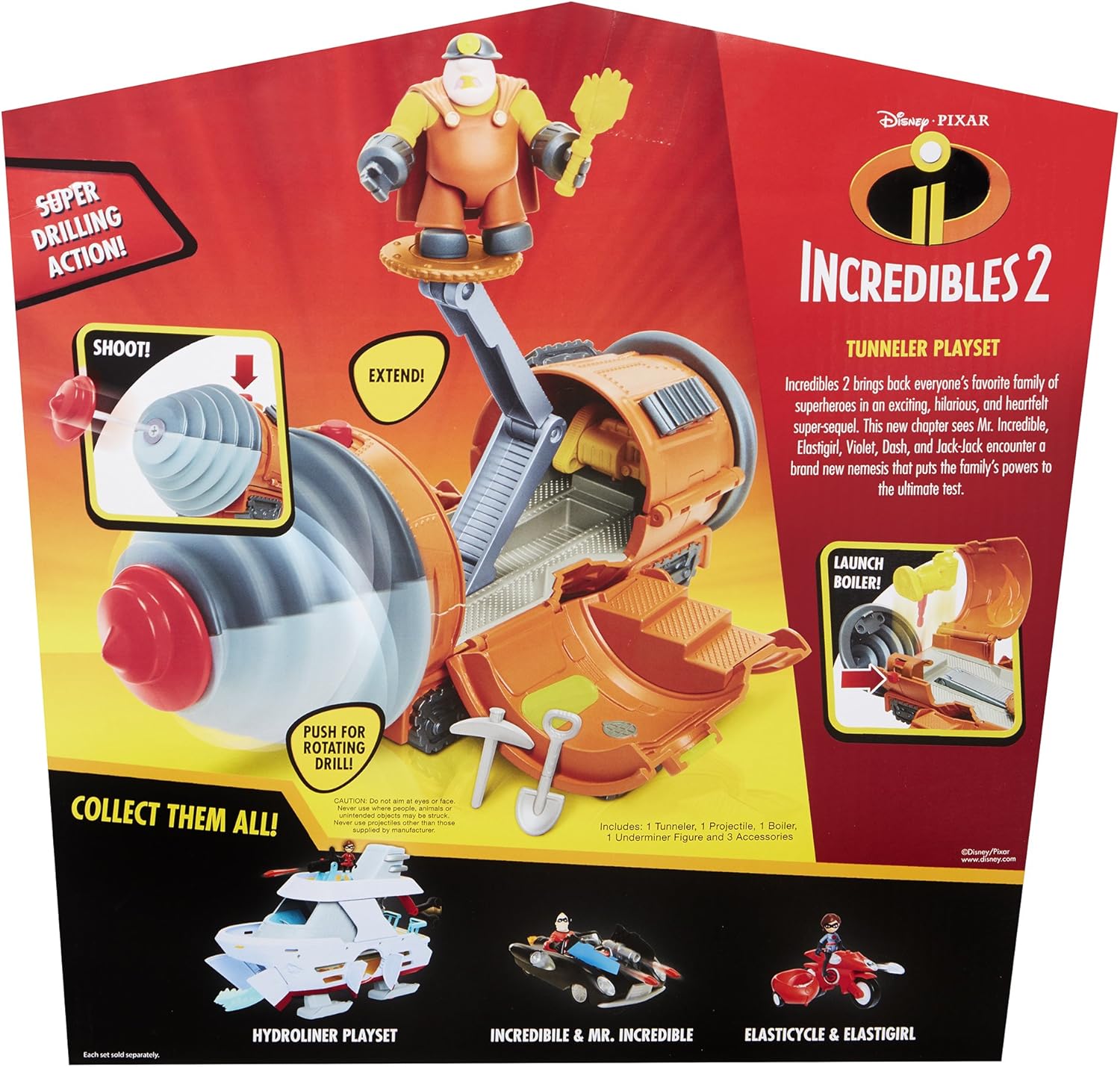 Disney Pixar's Incredibles 2 brings back everyone's favorite family of superheroes in an exciting, hilarious, and heartfelt super-sequel. This new chapter sees Mr. Incredible, Elastigirl, Violet, Dash, and Jack-Jack encounter a brand new nemesis that puts their power and their family to the ultimate test. Junior Supers Tunneler Playset recreates the encounter between the Parr family and the Underminer. Push forward for rotating drill, press button to shoot missile, extend the telescoping chair, launch the boiler! Includes: 1 Tunneler, 1 Missile , 1 Boiler, 1 Underminer figure, and 3 accessory pieces. No batteries required. Intended for kids ages 3-7.